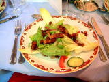 こちらは前菜のサラダ、チコリやズッキーニやレッドピーマンが、ダイナミックに飾ってありました。 |