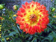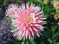 | この華やかなダリアも後ろの紫の花(紫の花火チカチカみたいな印象的な花、図鑑3冊探したけれど名前見つかりません、そのうち必ずやお調べいたします) ととてもマッチして綺麗でした。 |