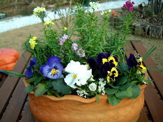 買ってきた苗で作った寄せ植え、写真に撮ると ちょっと暗めになって、もう少し赤い色入れればと思いましたが、庭にあるとこれぐらいがさり気なくって私は好きなんです。 |