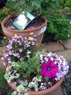 これも種からのロベリア、ペチュニア 苗から買ってきたのと違って バランスは悪いけれどかわい~ 後ろはグラミスキャスル、 何となく買って何となく植えた まだまだ薔薇はわからない私です。 |