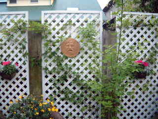 北側駐車場のラティス、ローマの思い出の壁掛け (真実の口)と夏用に植え替えた ペチュニアのハンギングがあります。 真ん中はキングサリこの時期は もう黄色い花は終わっていました。 左にはユリオシプデージーのコンテナーが。 |