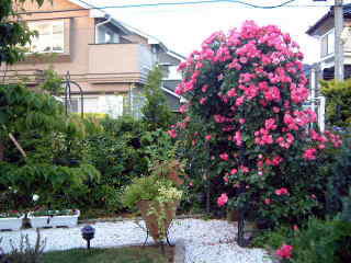 | 庭を作った時頂いた名も知らぬ赤い薔薇も 今年は花を沢山つけています。 |